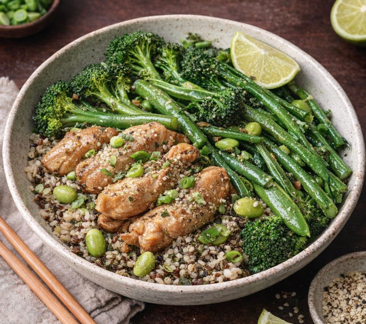 Ingredients 400g organic free-range chicken thigh fillets, chopped into large pieces 1 tbsp olive oil or avocado oil 2 cloves garlic, finely chopped 1 tsp fresh ginger, grated (optional) 1 cup green beans, trimmed 1 cup broccolini, chopped 1 cup broccoli florets 1 cup snap peas ½ cup shelled edamame beans (fresh or frozen) 1–2 tbsp tamari or soy sauce Cracked black pepper, to taste Optional: squeeze of lemon or lime juice Wild Rice & Quinoa Base ½ cup wild rice½ cup quinoaWater as per packet instructions Pinch of salt2 tbsp hemp seeds (to finish) To Serve (optional) Sliced spring onion Sesame seedsExtra cracked pepper Instructions Step 1 - Cook the wild rice & quinoa Rinse both grains well. Cook separately or together according to packet instructions (wild rice takes longer). Once cooked, fluff and combine. Season lightly with salt and set aside. Step 2 - Cook the chicken Heat oil in a large pan or wok over medium-high heat. Add chicken and cook for 5–6 minutes, turning until lightly golden and mostly cooked through. Step 3 - Add aromatics Add garlic and ginger. Stir for 30–60 seconds until fragrant. Step 4 - Add the greens Add green beans, broccolini, broccoli, snap peas and edamame. Stir-fry for 3–5 minutes until vegetables are tender-crisp and bright green. Step 5 - Season Add tamari or soy sauce and cracked black pepper. Toss well to coat. Finish with a squeeze of lemon or lime if desired. Step 6 - Assemb le the bowls Spoon wild rice & quinoa into bowls. Top with chicken and greens. Sprinkle with hemp seeds, spring onion and sesame seeds if using. Nutrition and Cooking Times Prep time: 15 minutes | Cook time: 25 - 30 minutes Serves: 2 adult servings Nutrient Value: Calories: 680cal | Protein: 43g | Fat: 24g | Carbohydrates: 48g