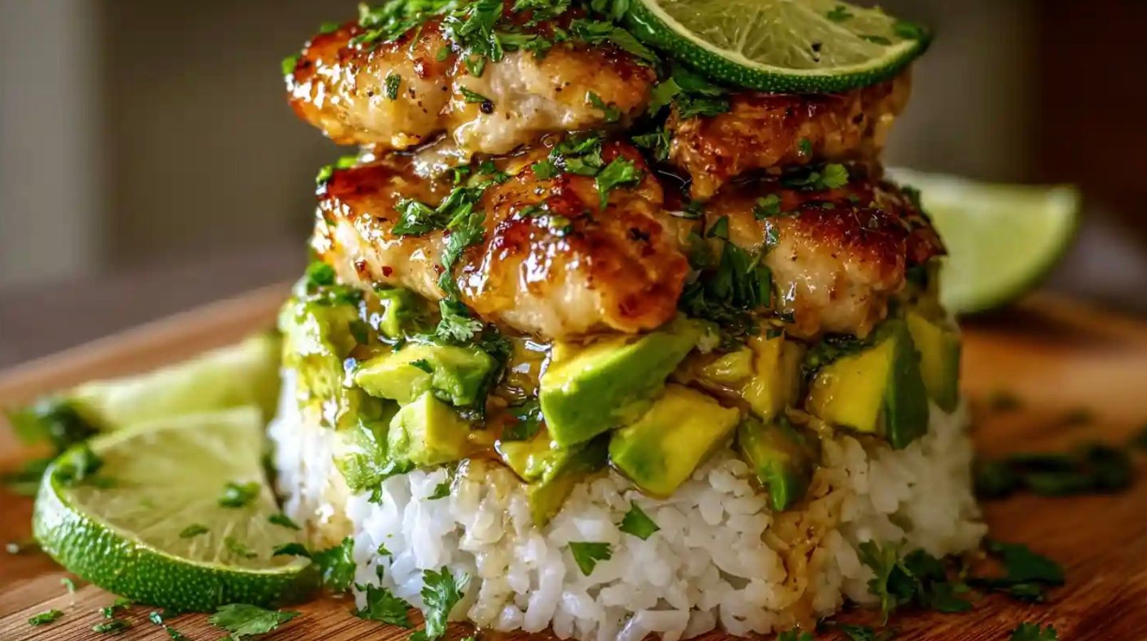 Ingredients 2 tbsp honey Juice and zest of 1 lime 1 tbsp olive oil 1 lb boneless skinless chicken, cubed 1 garlic clove, minced Salt & pepper, to taste 2 cups cooked rice (white or brown) 1 tbsp lime juice 1 tbsp chopped cilantro (optional) 1–2 ripe avocados, mashed Juice of ½ lime Salt & pepper, to taste Instructions Step 1 Marinate the chicken In a medium bowl, whisk together the honey, lime juice and zest, olive oil, garlic, salt, and pepper. Add in the cubed chicken. Toss to coat. Cover and refrigerate for 15–30 minutes. Step 2 Cook it golden Heat your best skillet for cooking chicken over medium-high. Sear the chicken without stirring for 2–3 minutes, then cook through, about 6–8 minutes total. Temp should hit 165°F. Step 3 Brighten the rice Fluff the warm rice with a fork. Stir in lime juice, salt, and cilantro if you like. Keep it fresh, not heavy. Step 4 Smash the avocados In a bowl, mash the avocados with lime juice, salt, and pepper. Don’t overdo it you want texture. Think creamy with little bites left in. Step 5 Stack it tall Place a ramekin or ring mold on the plate. Spoon in a layer of rice, then avocado, then the honey lime chicken. Press gently, lift the mold. A little tower of joy. Nutrition and Cooking Times Serves: 4 | Prep time: 15 minutes | Cook time: 15 minutes Total time: 30 minutes Nutrient Value per serve: Calories: 420kcal | Protein: 32g | Fat: 18g | Carbohydrates: 32g