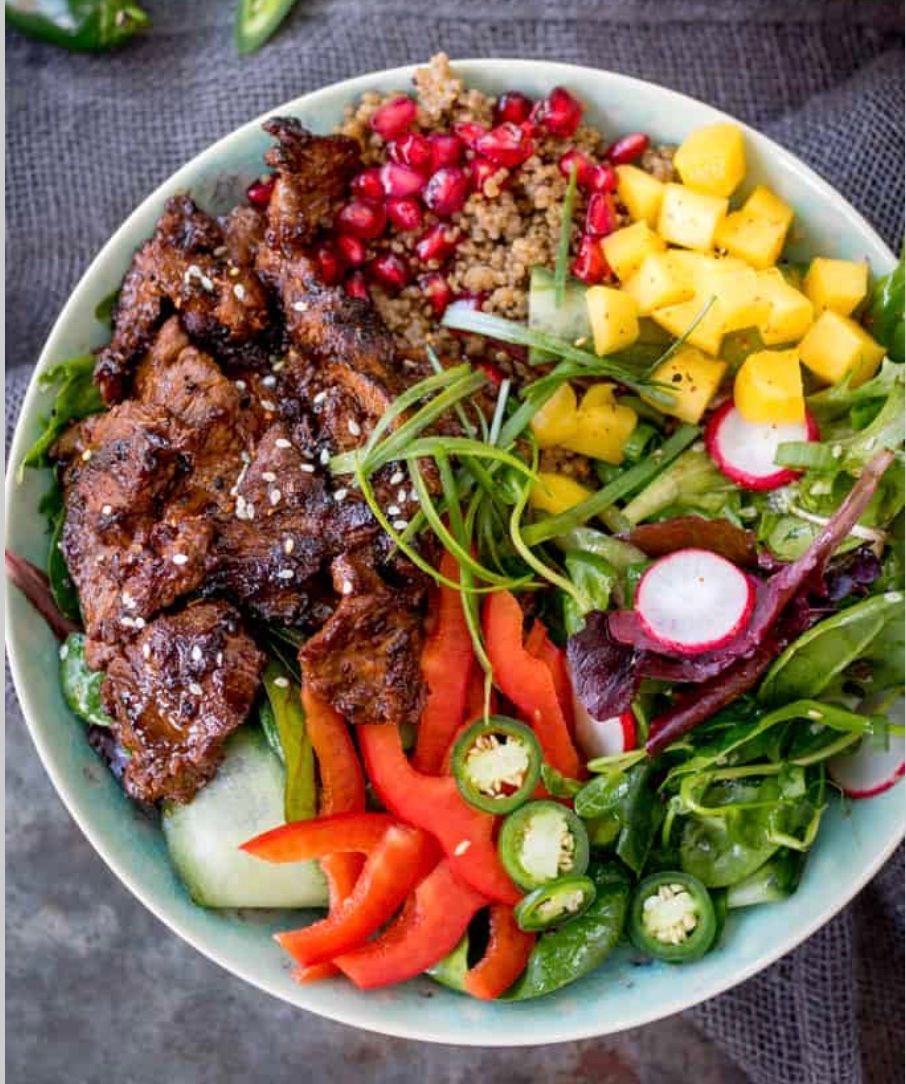 This grilled chicken and quinoa bowl delivers lean protein from juicy chicken breast and protein-rich quinoa, paired with colorful vegetables. It's a satisfying, nutrient-dense option that supports muscle recovery and growth.